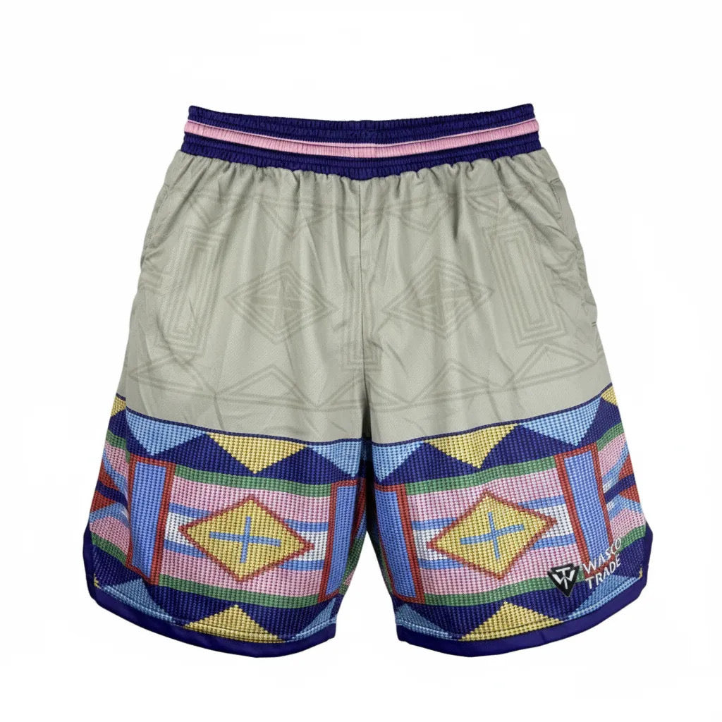 2 Pockets, Draw String, Standard Length. Sublimated printed to ensure longevity.